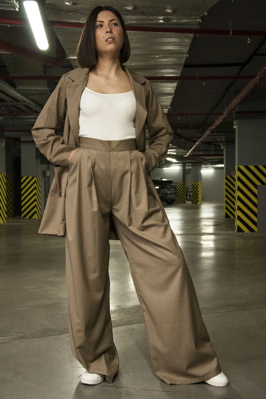 Свободные удлиненные брюки из тонкой ткани , высокая посадка, застежка на молнию сзади, 2 боковых кармана.