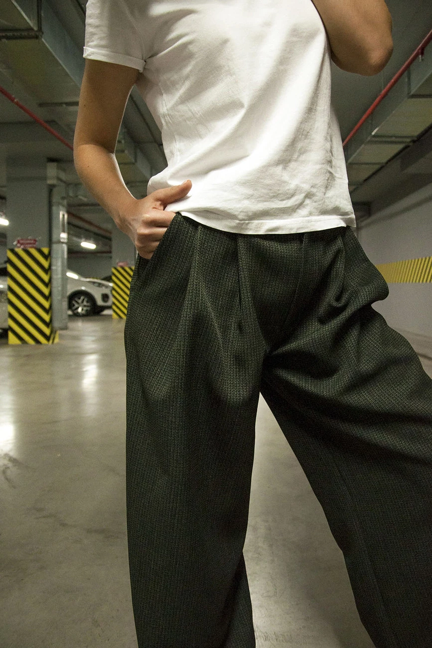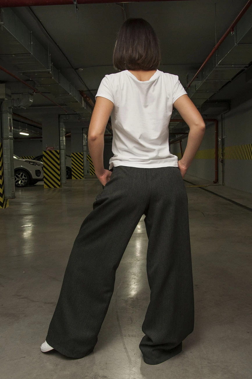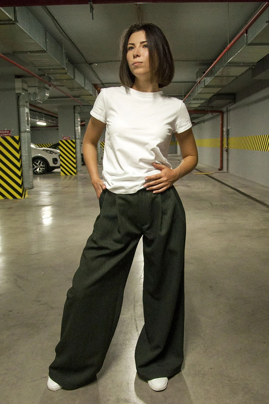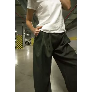 Свободные удлиненные брюки из тонкой ткани , высокая посадка, застежка на молнию и пуговицу, 2 боковых кармана.