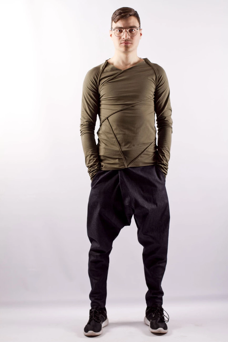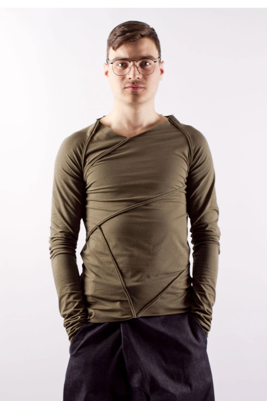 Асимметричная модель, удлиненные рукава, необработанные края изделия