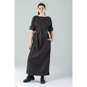 Длинное платье с поясом и боковыми карманами, V - образный вырез и разрез сзади.