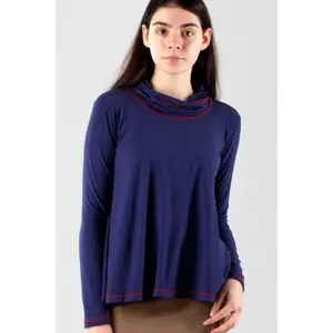 Удлиненная расклешенная модель с длинным рукавом, воротником-стойкой и контрастной отстрочкой швов