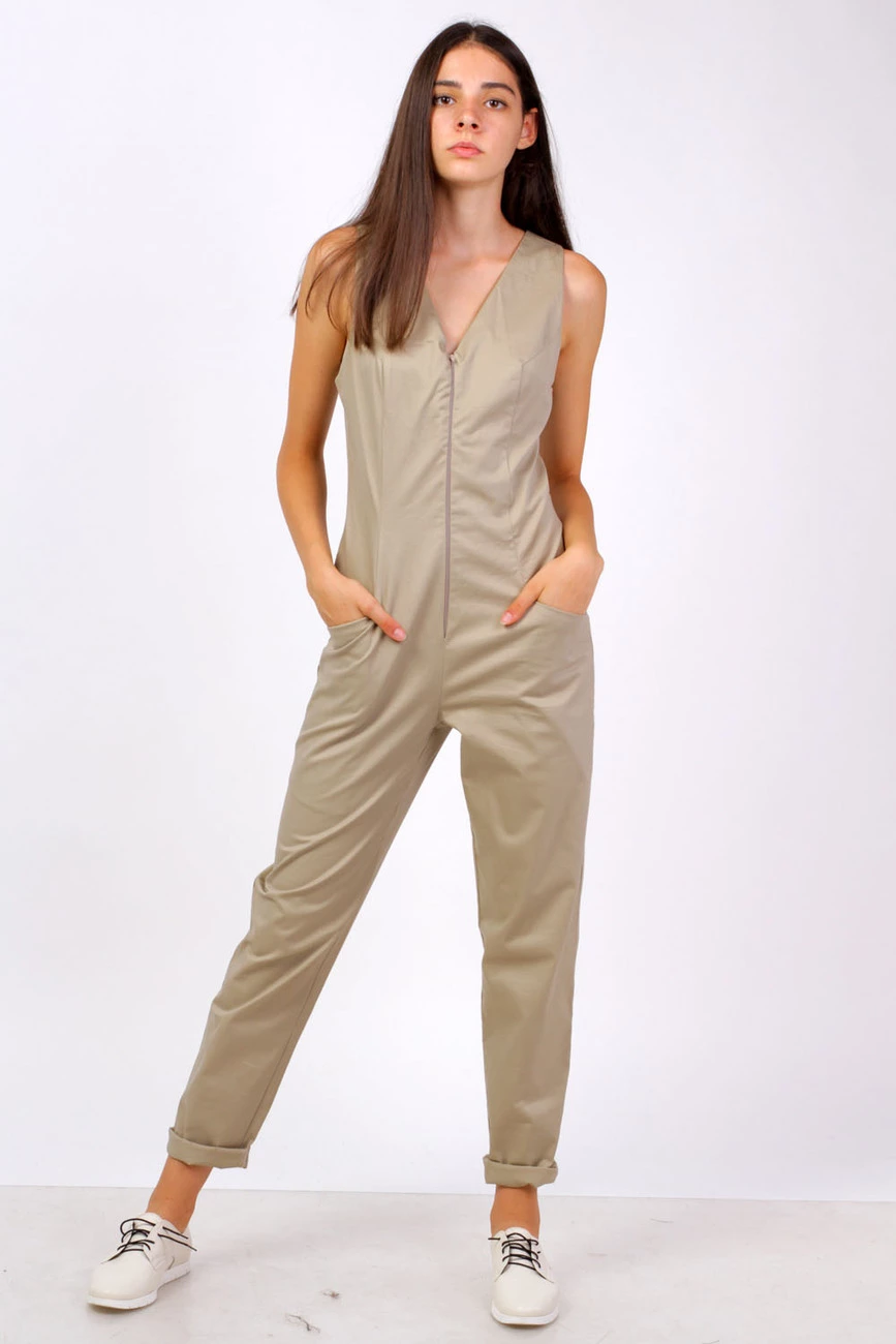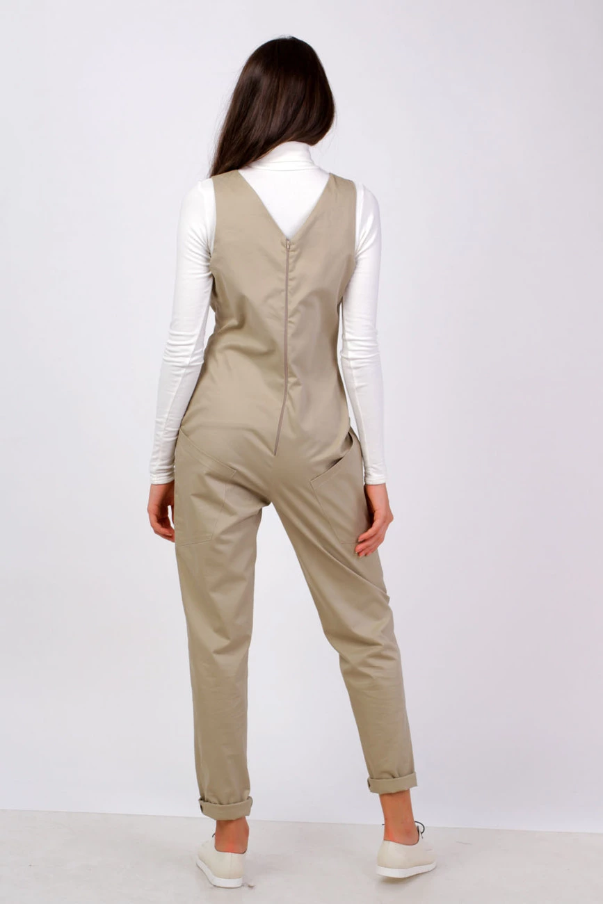 модель со змейками и карманами впереди и сзади, V - образный вырез впереди и на спине, длинные зауженные штанины .