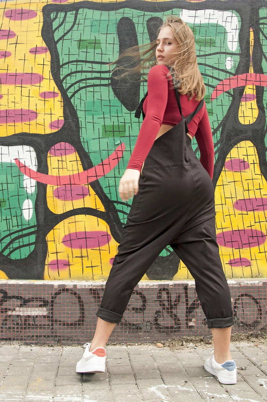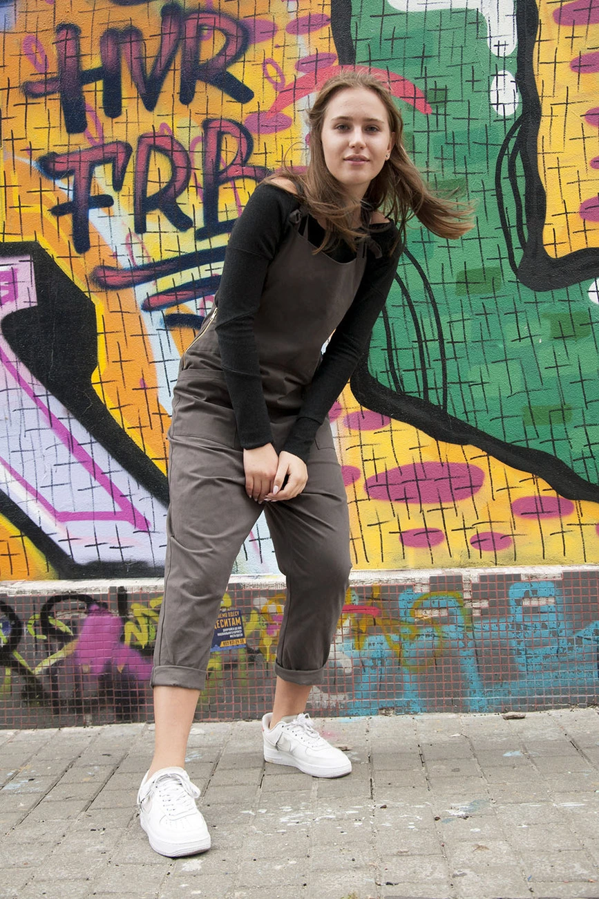 комбинезон свободного кроя на завязках, с накладными карманами, змейка в боковом шве, зауженные штанины с отворотами внизу