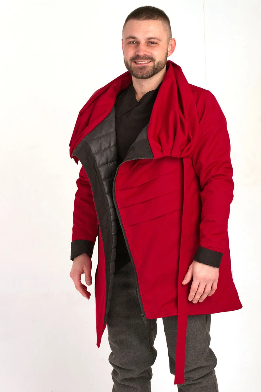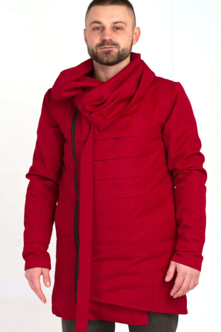 Удлиненная куртка с длинным рукавом и драпирующимся воротником-капюшоном. Застежка на змейку. Два боковых кармана.