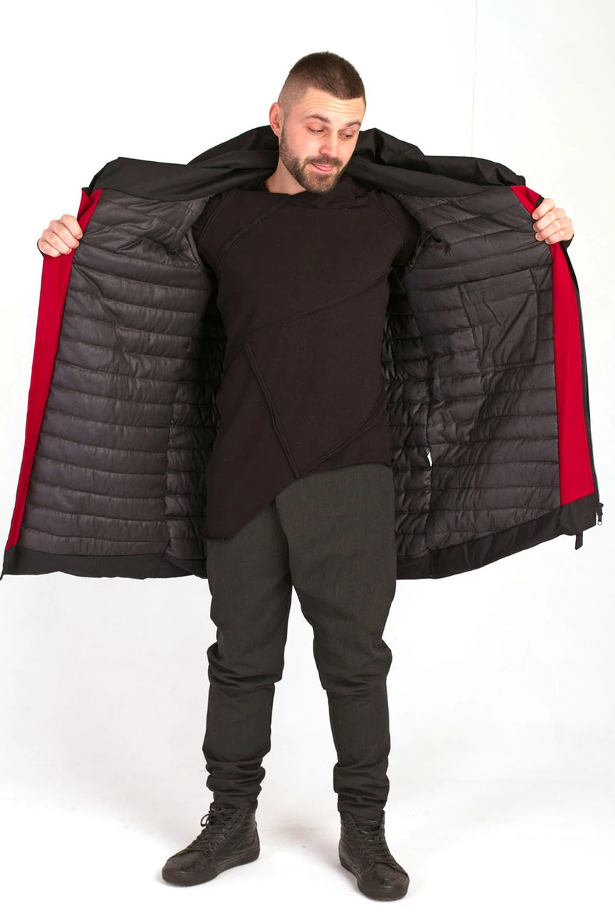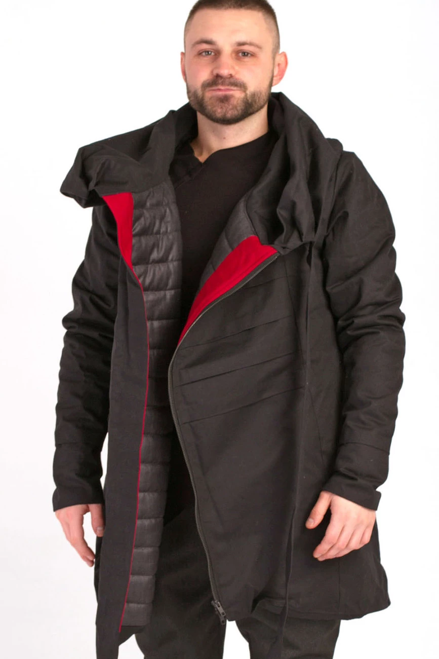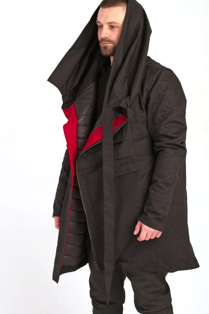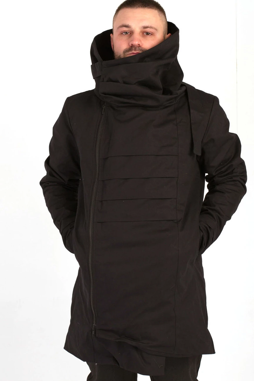 Удлиненная куртка с длинным рукавом и драпирующимся воротником-капюшоном. Застежка на змейку. Два боковых кармана.
