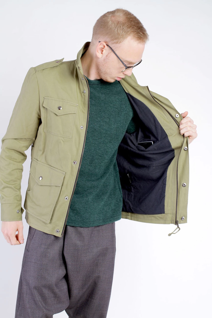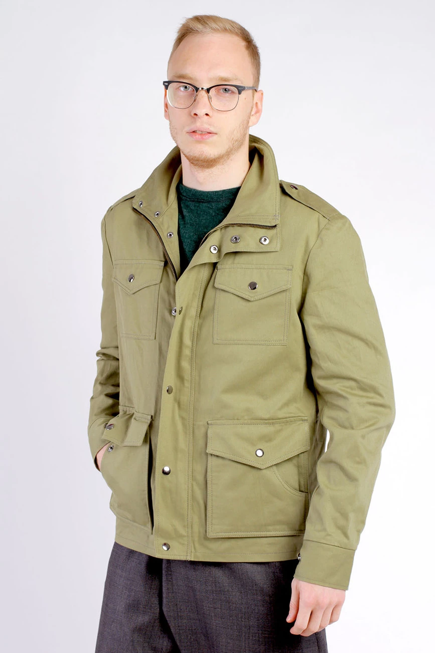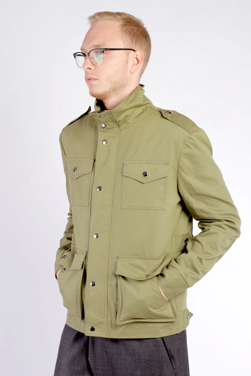 Свободная куртка из плотного коттона, на подкладке, 4 накладных кармана спереди, застежка на молнию и кнопки.