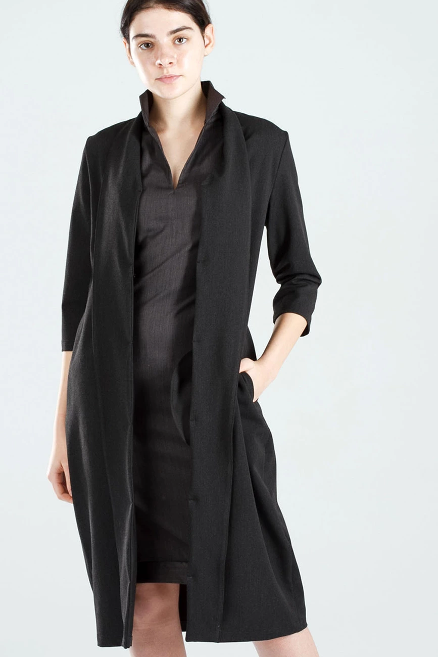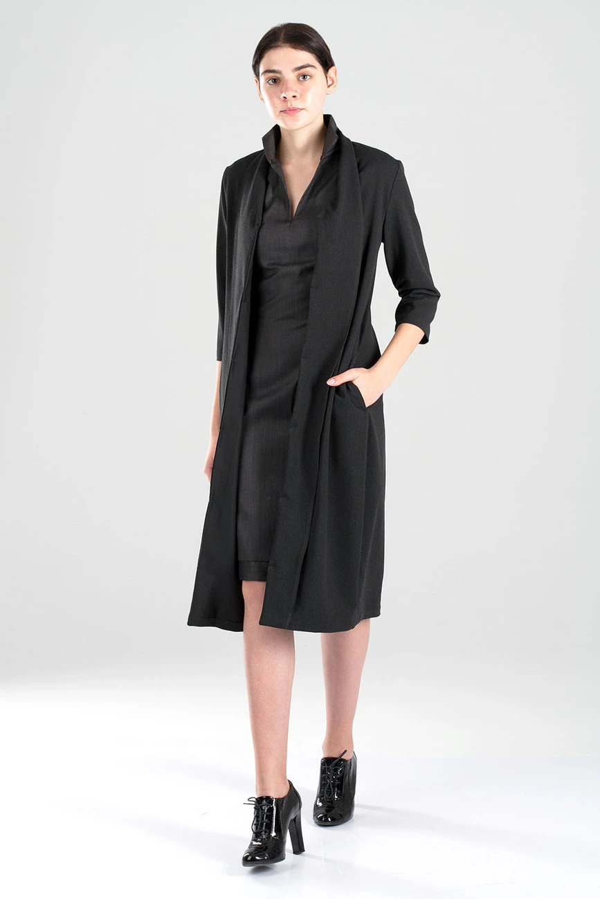 Платье-накидка с застежкой на крючки и пояс, V - образный вырез с отворотом, длина миди, карманы в боковых швах, рукав 7/8