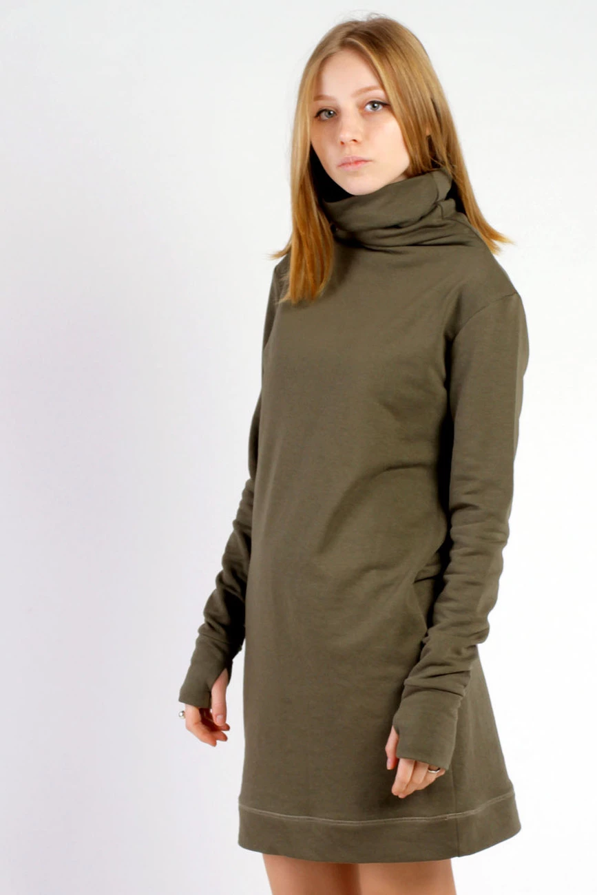Платье-туника длиной до колена из плотного трикотажа (двухнитка), длинный рукав с отверстием для пальца, цельнокроенный воротник-стойка, карманы в боковых швах