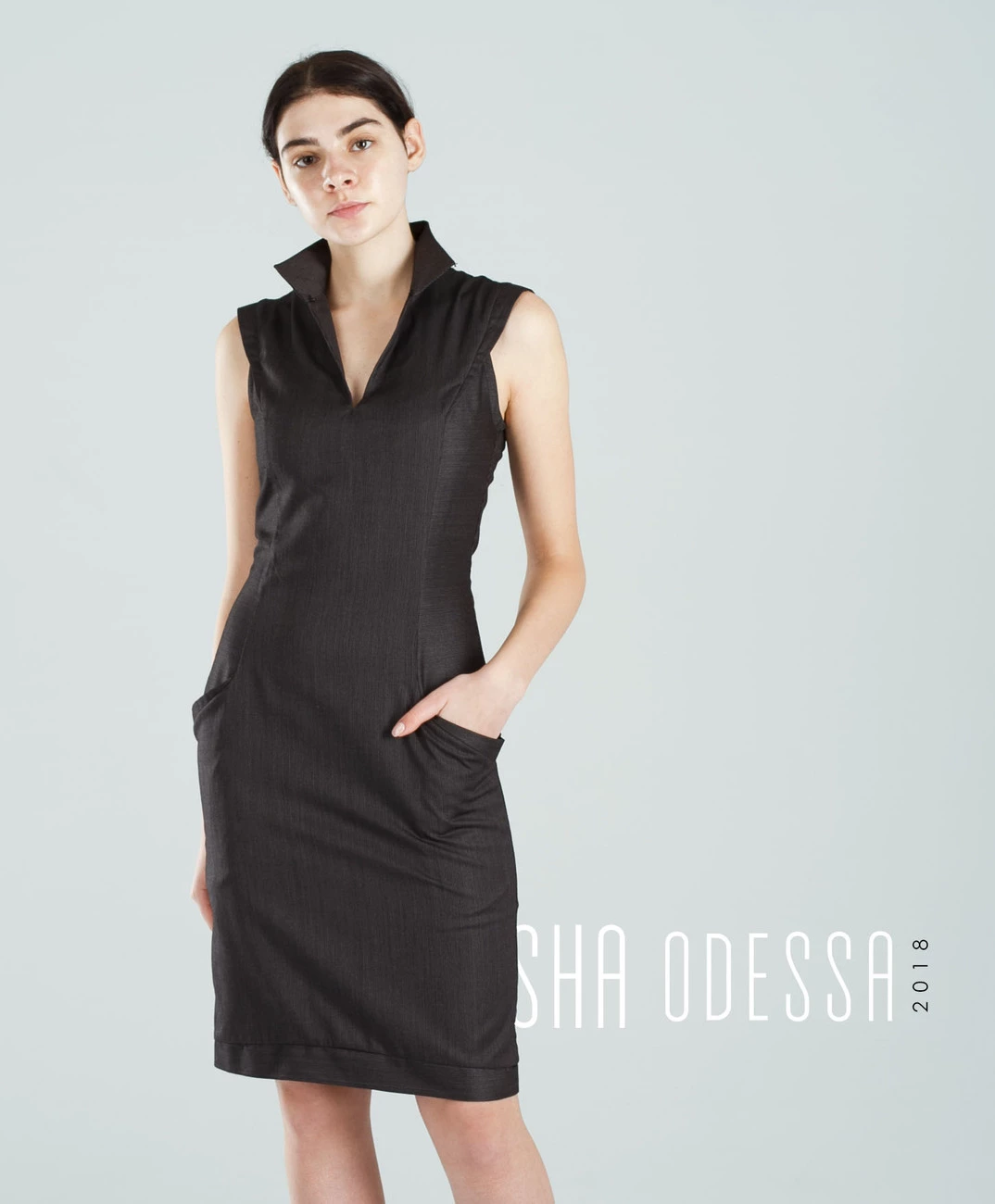 Приталенная, зауженная книзу модель с V - образным вырезом и небольшим воротником, два цельнокроенных кармана по бокам