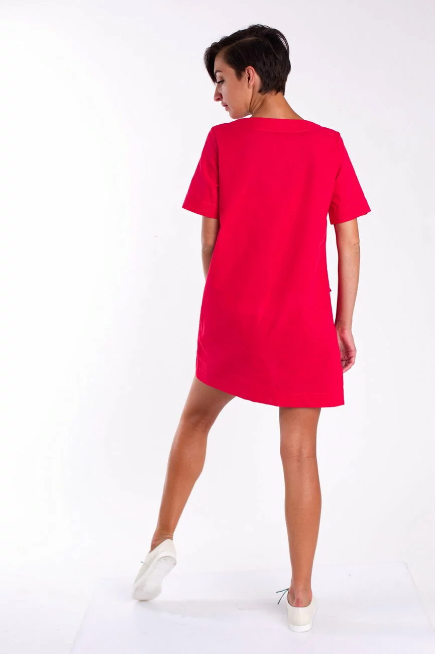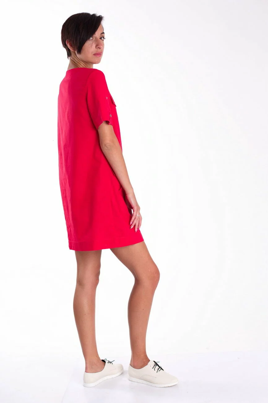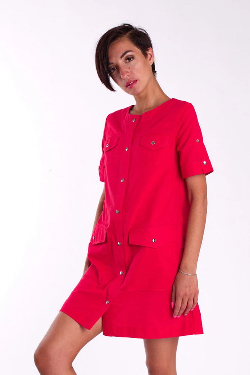 Свободная модель в стиле сафари, длина выше колена, короткий рукав, 4 накладных кармана, застежка на кнопки