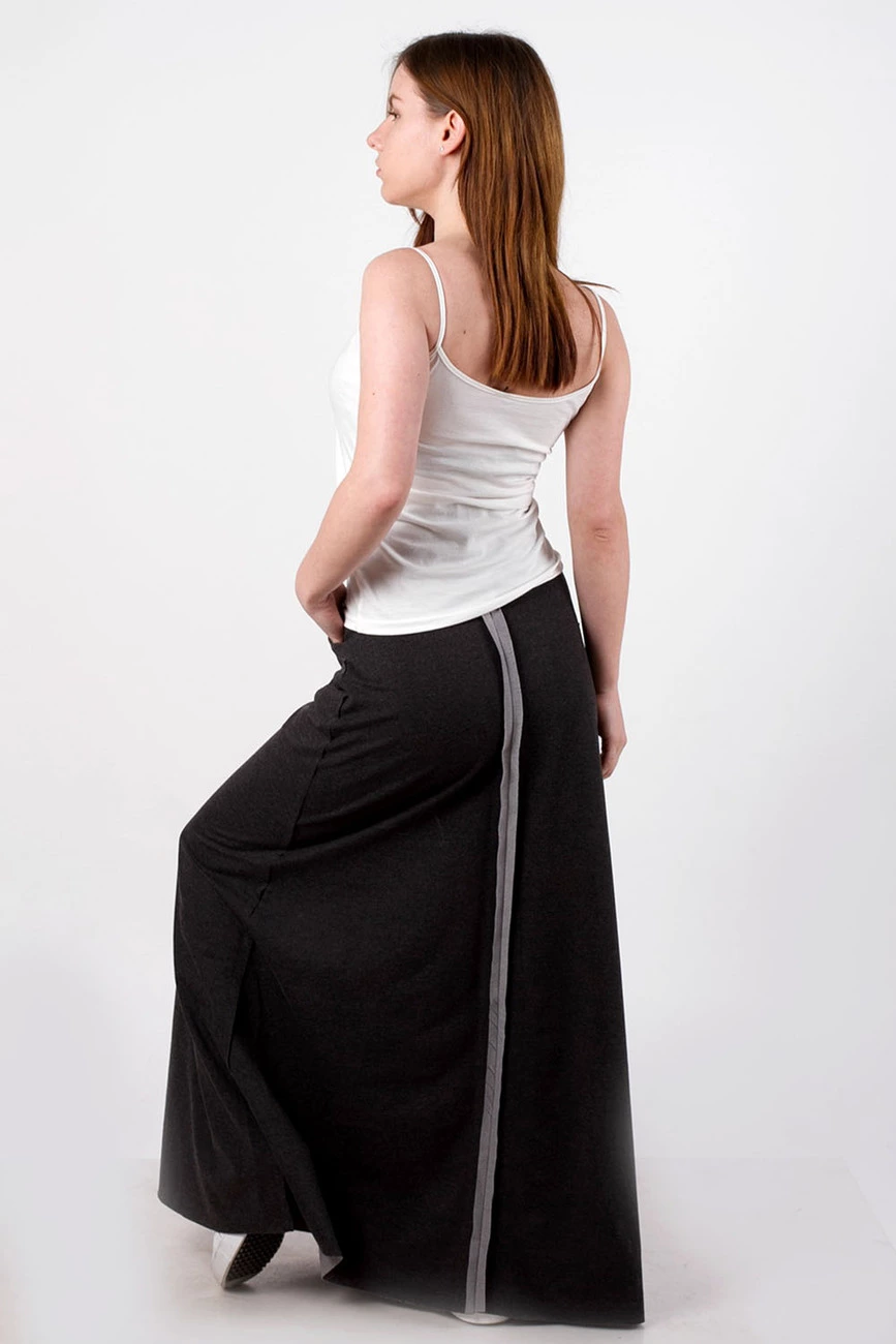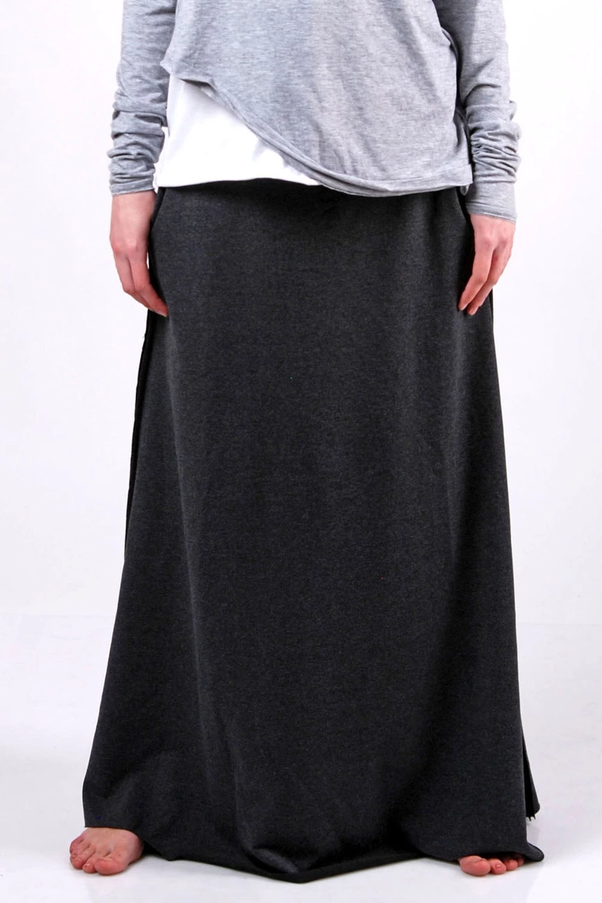 Юбка из хорошо держащего форму трикотажа, длина макси, застежка сзади на потайную молнию, два кармана.